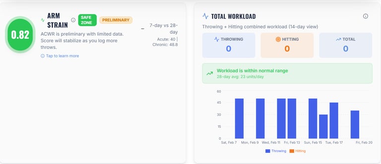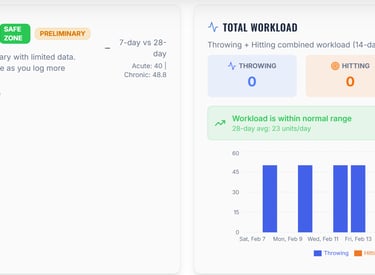 Our dashboard tracks workload and biomechanics, while custom programs guide safe throwing tailored to each player’s needs.